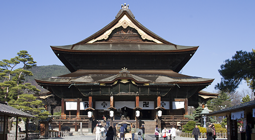 善光寺 5万9000平方mの敷地を持つ境内に、大勧進と大本願など39の塔頭からなる天台宗と浄土宗の大寺院。「牛にひかれて善光寺参り」で全国的に知られるように、一生に一度はお参りしないと極楽に行けないと、参拝者が絶えません。今日では年間700万人もの人々が訪れます。