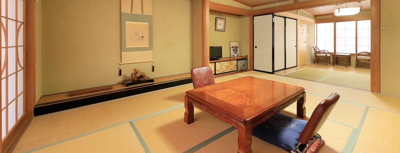 Our guest rooms are traditional Japanese-style rooms known as Washitsu. Igusa, soft rush straw, is used for the material of tatami flooring.